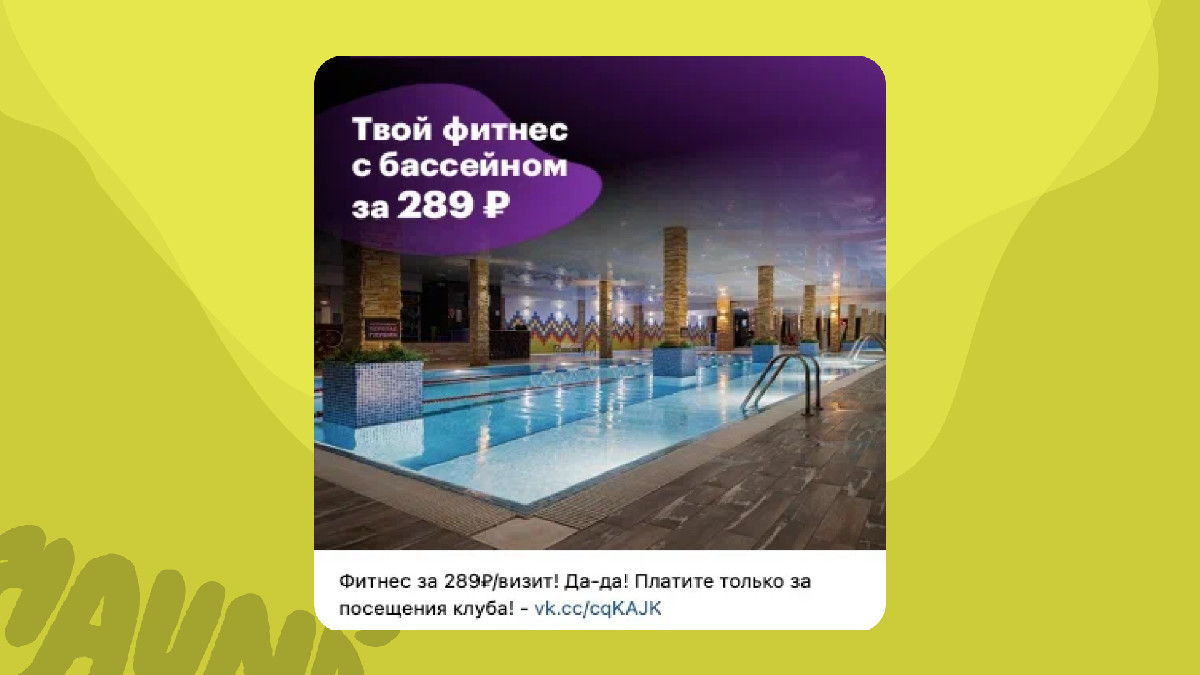 Еще один пример — «Бассейн + фитнес 330 ₽ за визит». Итог аналогичен: высокий спрос и быстрая конверсия. Разные вариации этого оффера мы использовали и в Москве, и в Екатеринбурге, и в других локациях. Везде работает одинаково хорошо.