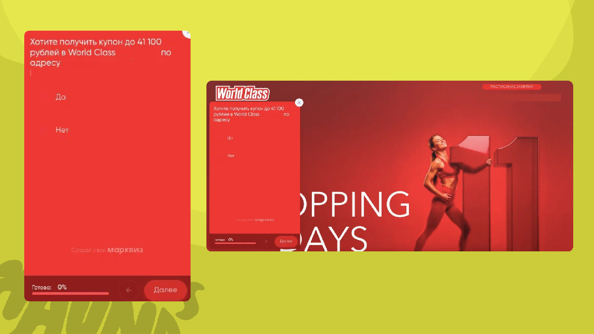 Пример на живом кейсе: региональный франчайзи World Class организовали акцию, которая длилась один день. Никогда ранее этого предложения еще не было, и вряд ли в ближайшее время будет. Новую карту можно было купить за 9 990 ₽. Результат — конверсия 30% в заявку.