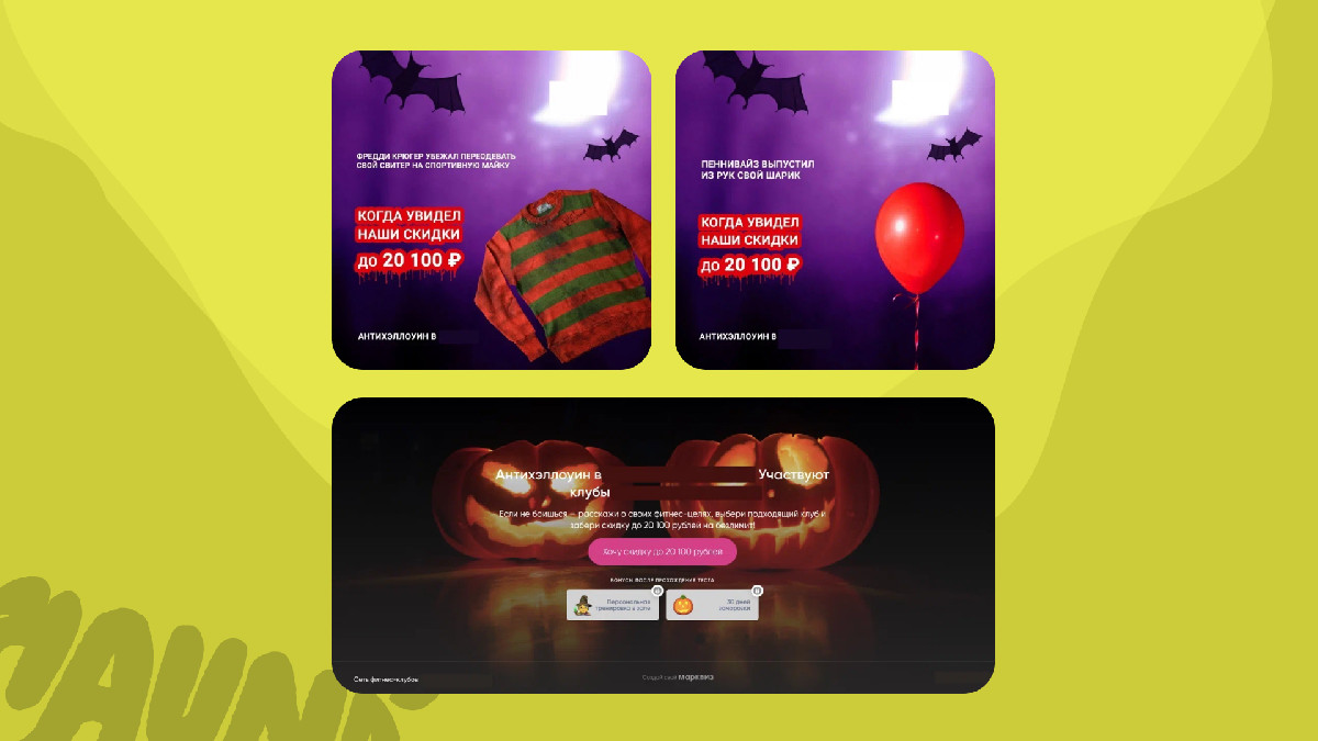 Когда баннер с гантелями уже не работает, пора играть в мемы и культуру. Пример несколько отстал от даты, но его можно использовать в качестве аналогии: кампания «АнтиХэллоуин» с креативами не по брендбуку, но с тыквами, свитером Фредди Крюгера и красным шариком страшного клоуна. Результат: 13 заявок из 65 открытий, конверсия 20%.