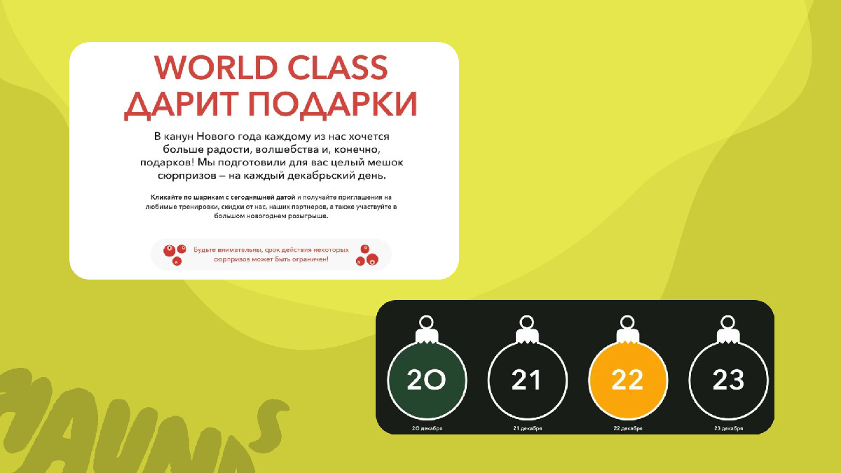 Элегантное решение — адвент-календарь на сайт. Каждый день планируйте новый мини-бонус: массаж, диагностика, гостевой визит. По факту можете раздавать их и в обычное время, но здесь срабатывает фактор ожидания, появляется возможность выкатывать новые креативы вроде «Зайди и получи новый подарок!». Пример: сделали премиум-клубу адвент, который ежедневно до Нового года открывал очередную плюшку. Результат — CPL 790–800 ₽, рост вовлечения и повторных визитов.