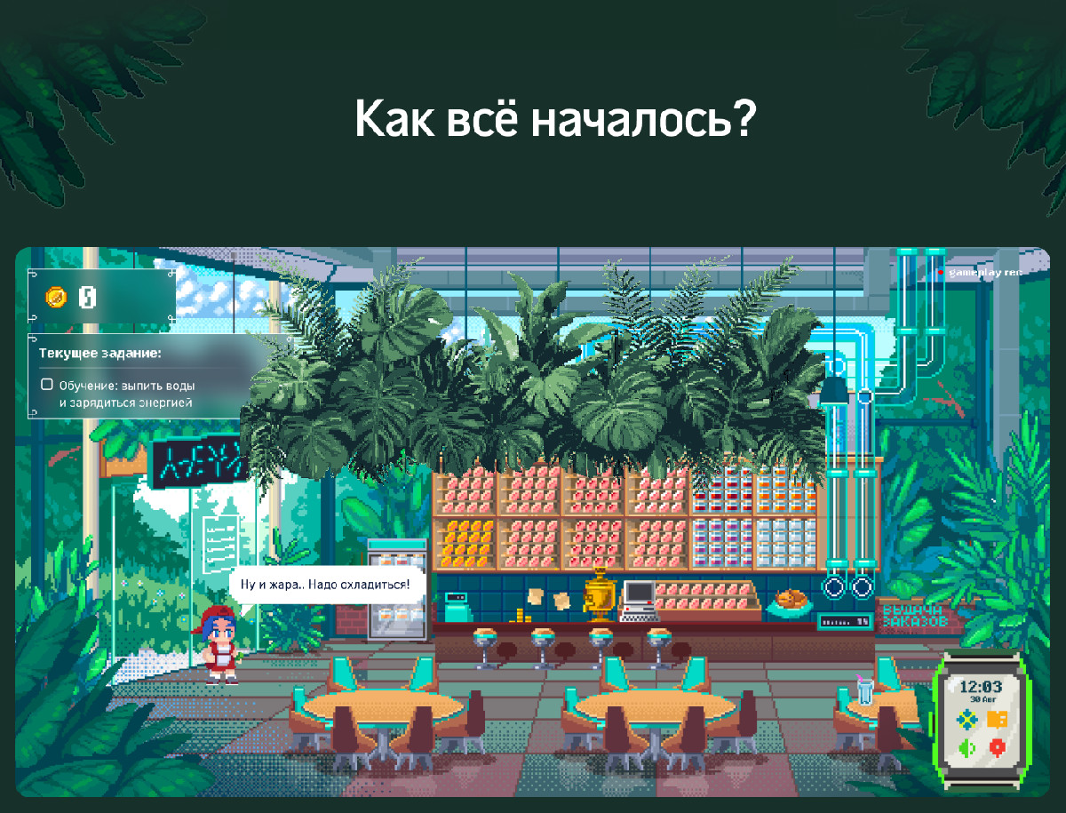 Проект стартовал с краткого брифа на обучающую игру и вырос в полноценную бизнес-симуляцию с развитым сюжетом, художественным миром и сложной механикой.