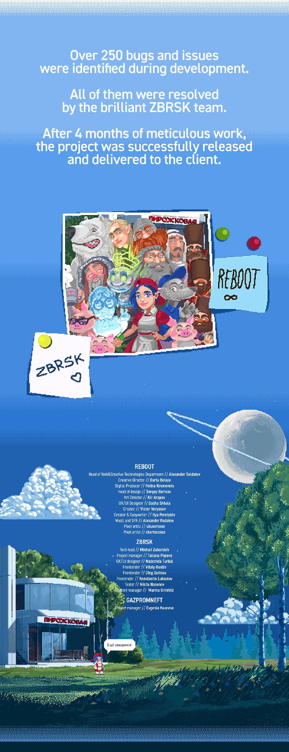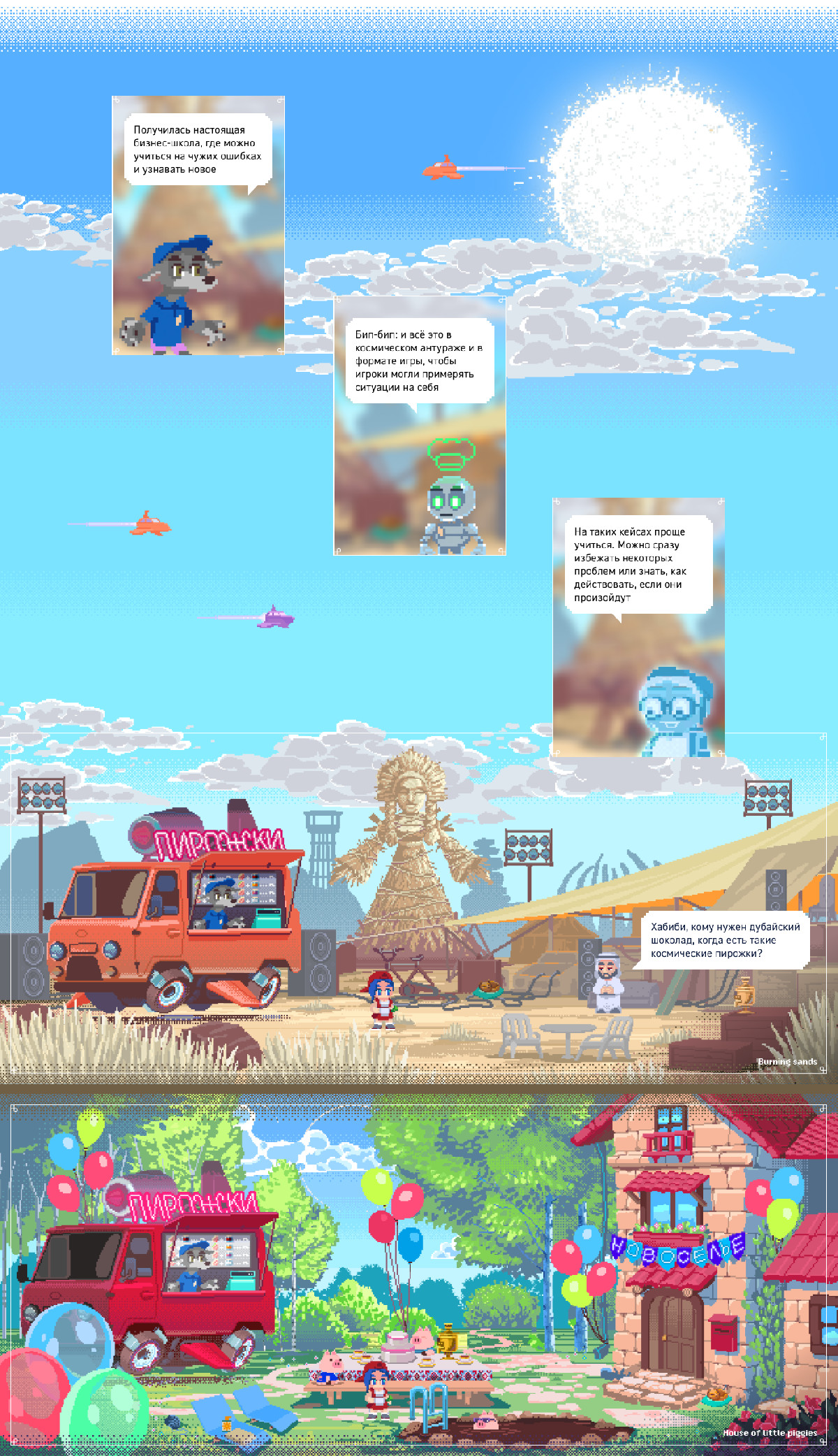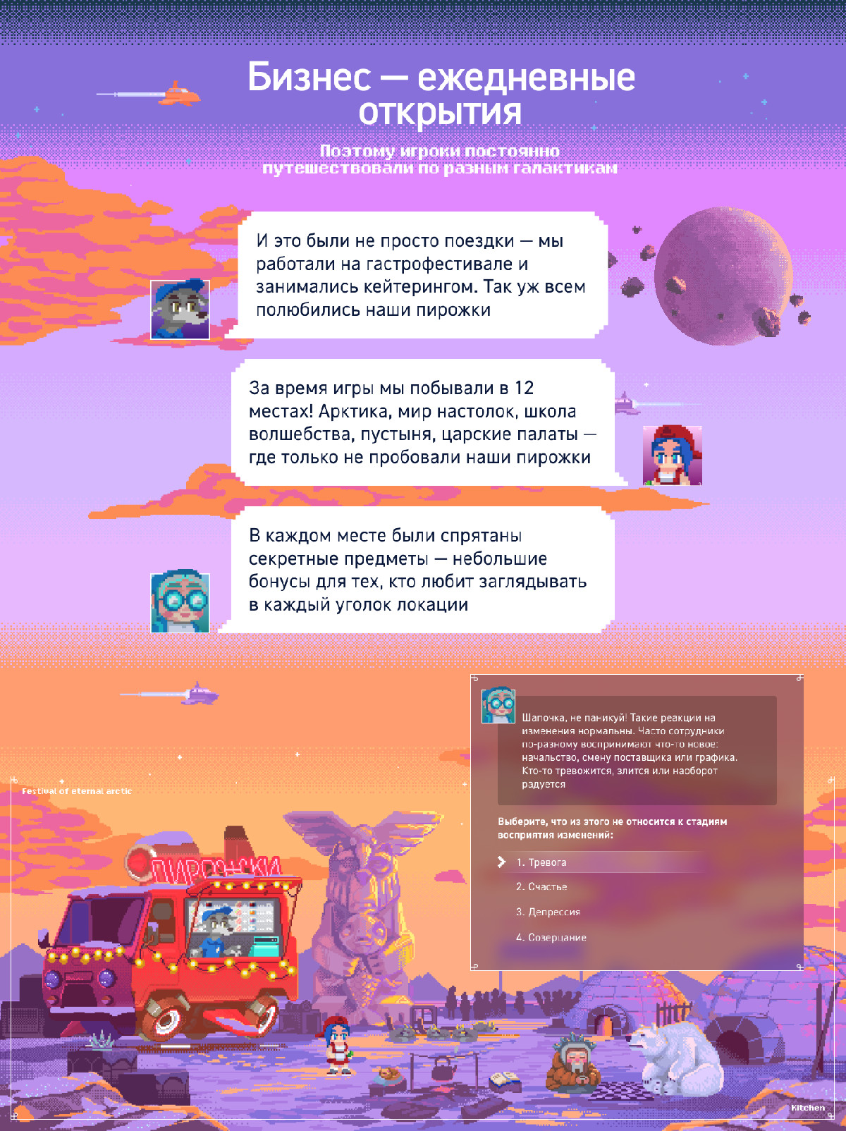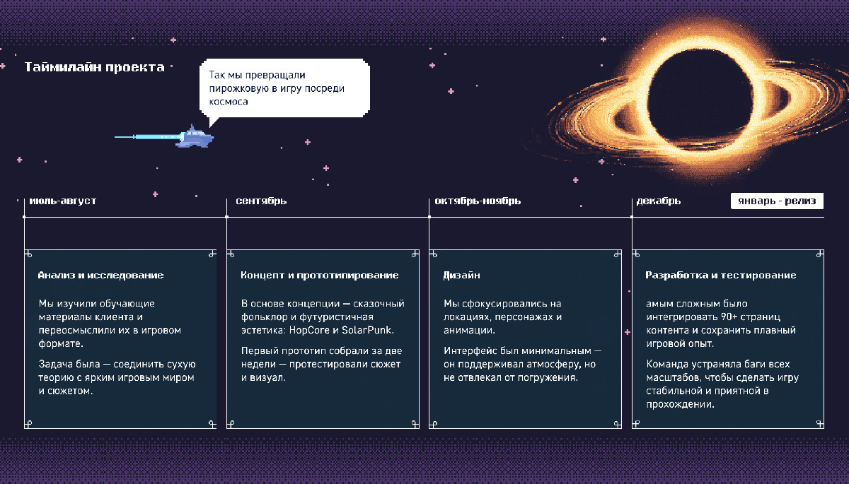 Бизнес-симуляция для Газпром нефти: сюжет — пирожковая в космосе на основе сказки, 5 глав, 12 локаций, пиксель-арт, 36 заданий, 97% завершения курса, геймификация, обучение управлению и мотивации команды. Проект — 100+ часов работы, сценарий — 115 страниц.