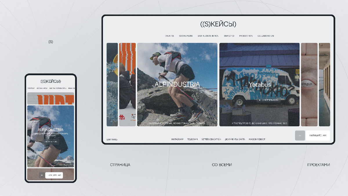 Пользователи, попадая на сайт, могут не только найти для себя необходимую информацию о кейсах и о студии, но и погрузиться в ценности бренда, стать частью креативного комьюнити, которое выстраивает SETTERS вокруг своей деятельности, и таким образом, находит единомышленников.