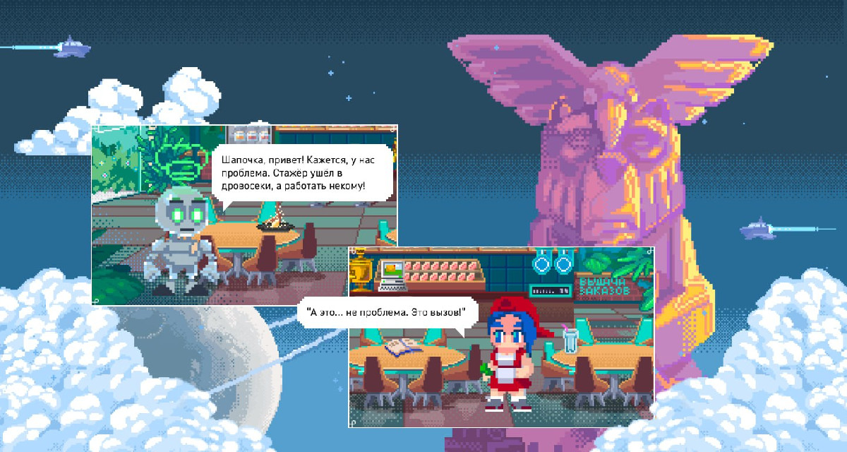 Графика проекта выдержана в стилистике пиксель-арта с элементами соларпанка и hopecore.