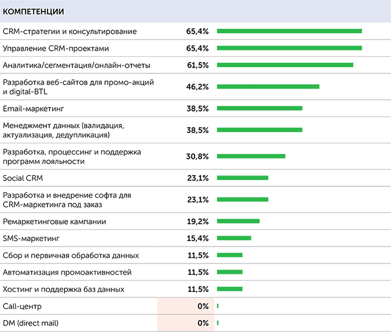 11,5% опрошенных агентств не предоставляют отдельно никаких услуг, работая только в составе CRM-проектов. Остальные участники опроса отметили следующие услуги: