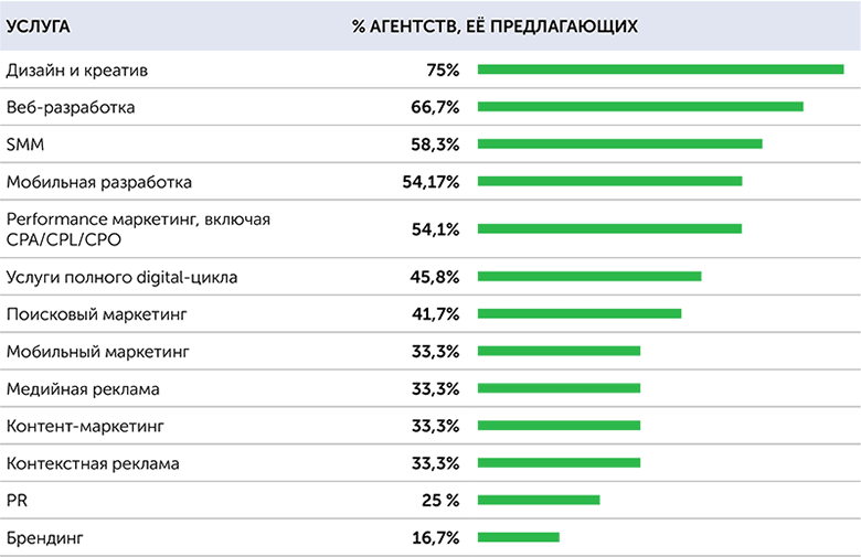 Как видим, наиболее распространены услуги дизайна/креатива, разработки веб- и мобильных проектов, а также услуги по SMM-продвижению.