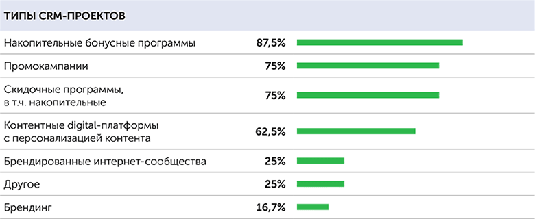 При опросе участников рынка чётко выделяются три основных типа проектов, на которые ориентируются создатели CRM-маркетинговых платформ. Это: