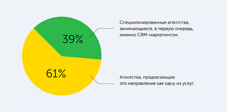 39% опрошенных агентств относят себя к специализированным, т.е. занимающимися, в первую очередь, именно CRM-маркетингом. Ещё 61% – предлагают это направление как одну из услуг.