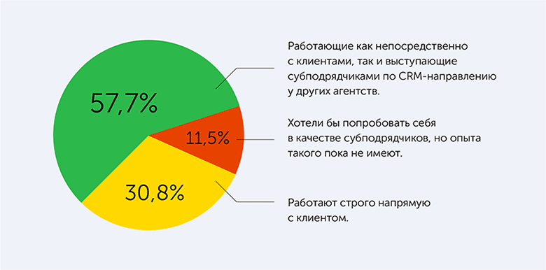 57,7% агентств работают как непосредственно с клиентами, так и выступая субподрядчиками по CRM-направлению у других агентств.
