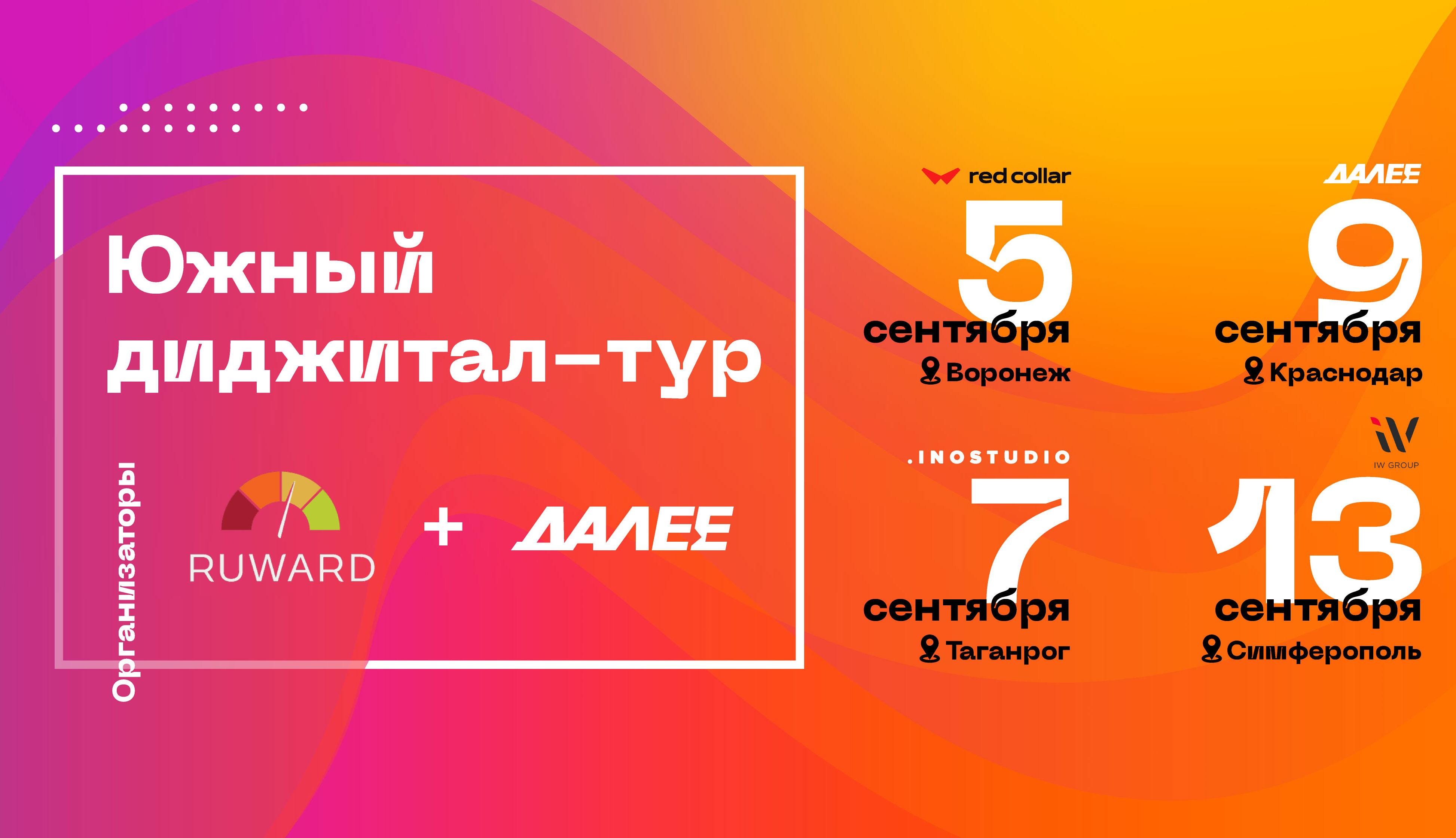 В сентябре 2022 года RUWARD совместно с ДАЛЕЕ проведут серию из четырех конференций в городах юга России для представителей digital-агентств и веб-продашкенов.
