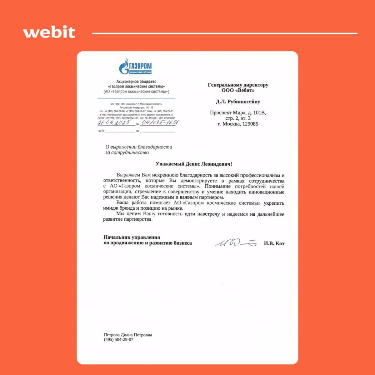Благодарственное письмо от АО «Газпром космические системы»
