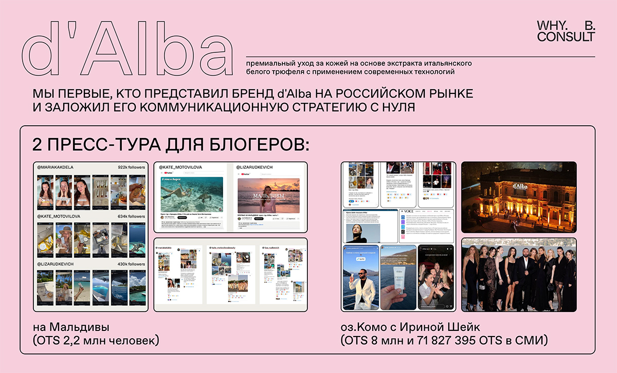 Мы первые, кто представил бренд d’Alba на российском рынке и заложил его коммуникационную стратегию с нуля. В нашу работу входит сопровождение блогеров во время пресс-туров и сбор отчётов, освещение ключевых событий и запуска новинок бренда через пиар и инфлюенс-маркетинг, участие в организации мероприятий от бренда, разработка стратегии продвижения.