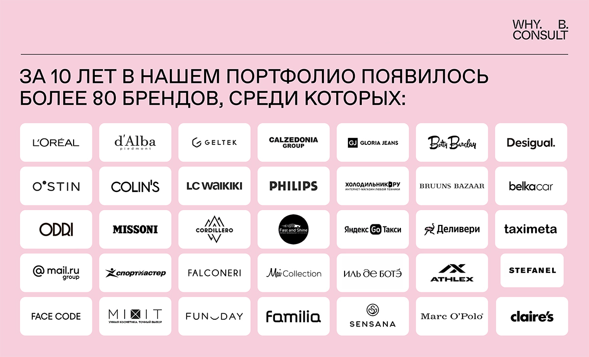 За 10 лет работы агентство реализовало более 200 проектов для более чем 80 брендов в 15+ странах, включая крупные международные компании и лидеров своих отраслей от масс-маркета до люкса: Calzedonia, LC Waikiki, L’Oréal, d’Alba, Philips, Delivery, Colin’s и другие.