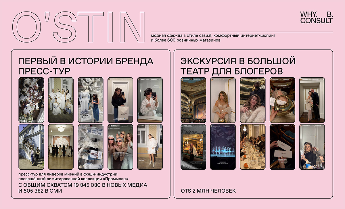 - первый в истории бренда пресс-тур для лидеров мнений в фэшн-индустрии посвящённый лимитированной коллекции «Промыслы» с общим охватом 19 845 080 в новых медиа и 505 382 в СМИ
