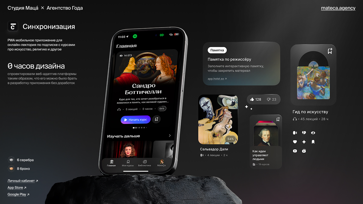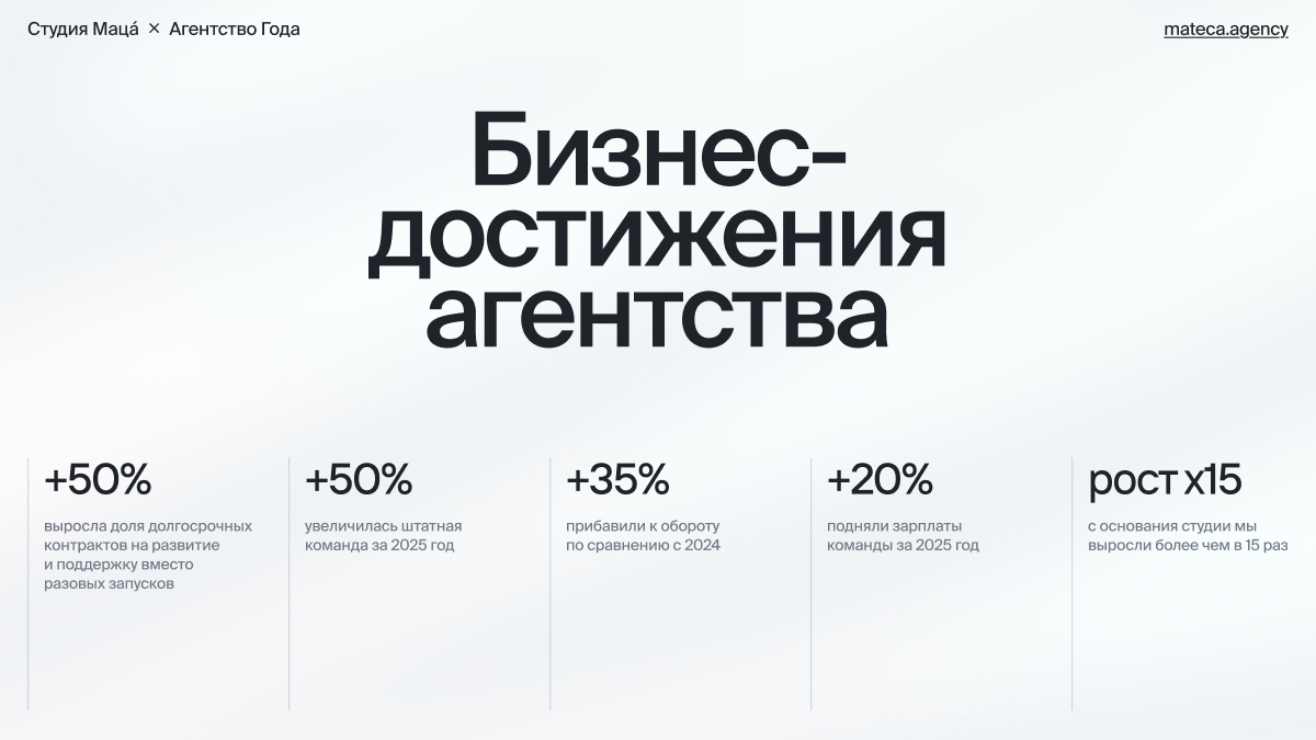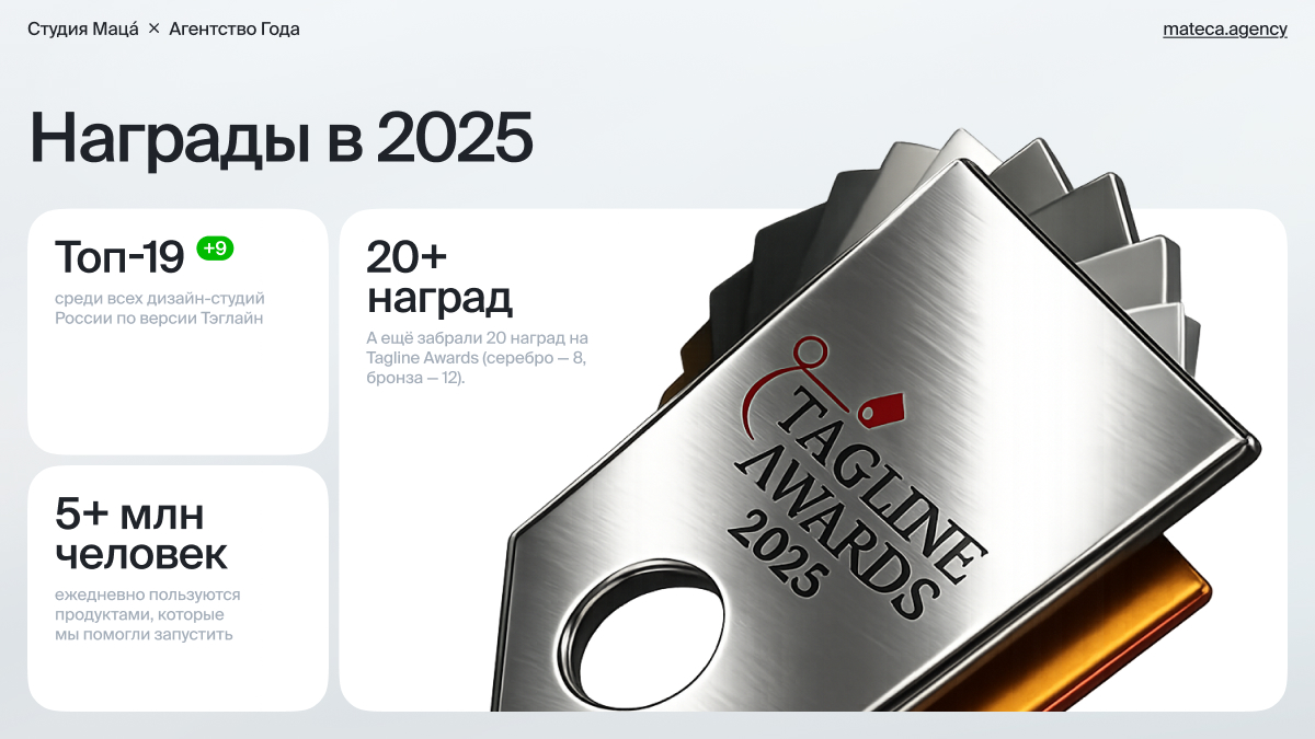 - Из классных достиженией — в рейтинге Tagline мы прибавили +9 позиций по сравнению с 2024, вошли в топ-19 студий дизайна. А ещё забрали 20 наград на Tagline Awards (серебро — 8, бронза — 12).