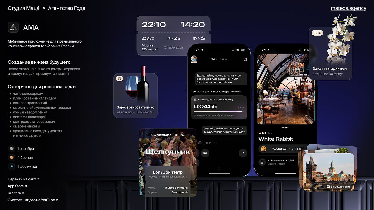 - Сделали АМА — премиальный консьерж-сервис от ВТБ. Внутри — экосистема с маркетплейсом закрытых привилегий, селф-сервис и CRM-система. В формате концепта мы прикинули, как будет реализован ИИ, предугадывающий желания. Из результатов здесь — проект получил инвестиции и стал развиваться дальше:)
