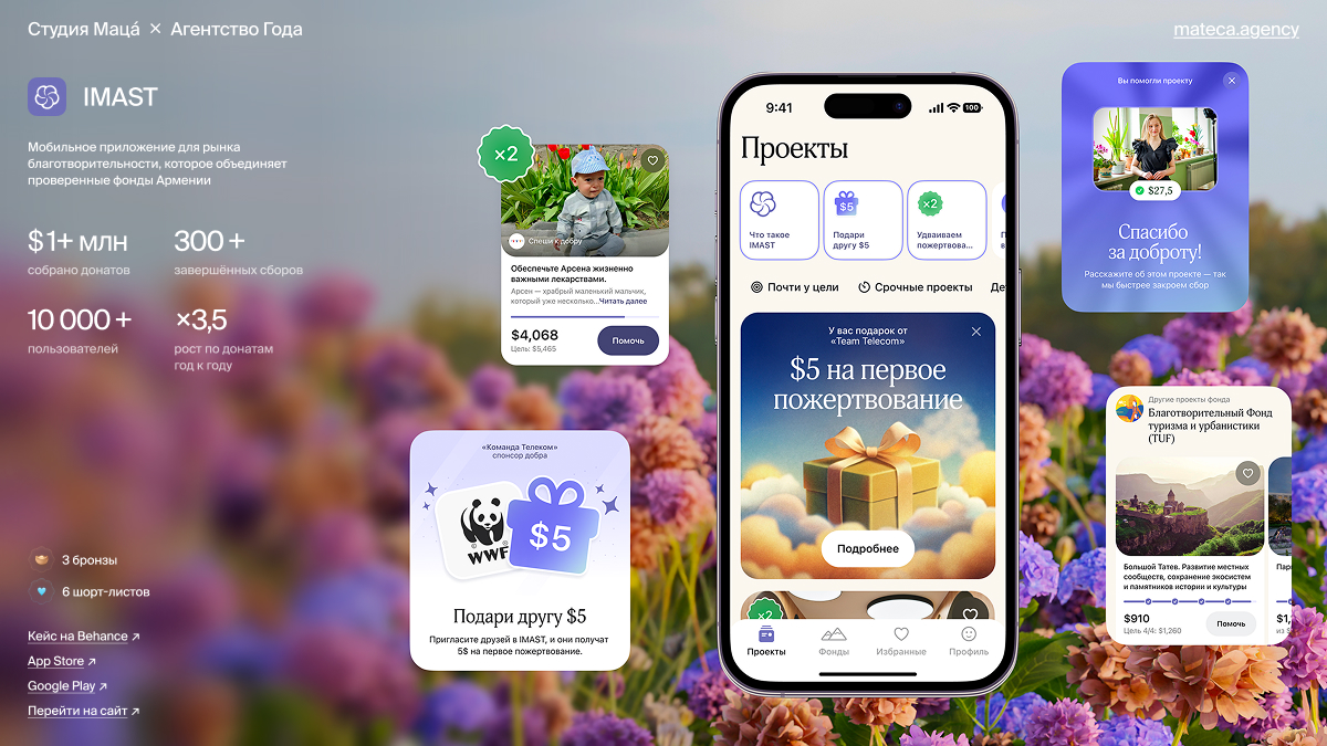 - Продолжаем развивать IMAST (ещё один проект Гайка Айрапетяна) — благотворительное приложение для помощи гражданам Армении. Мы сделали маркетплейс благотворительных инициатив с удобным каталогом, рекуррентными платежами и геймификацией, а ещё разработали всю коммуникационку. Из классных фактов: за два года к платформе подключились 25 фондов и 300+ проектов, а сумма сборов превысила $1 млн.