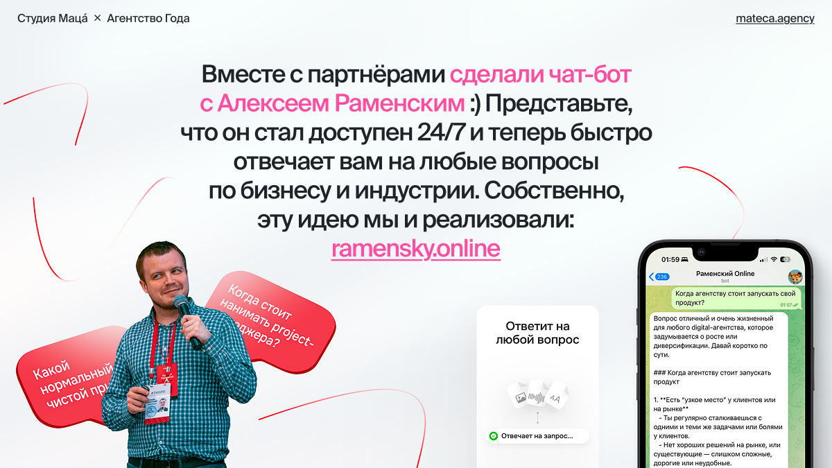 - Вместе с партнёрами сделали чат-бот с Алексеем Раменским:) Представьте, что он стал доступен 24/7 и теперь быстро отвечает вам на любые вопросы по бизнесу и индустрии. Собственно, эту идею мы и реализовали.