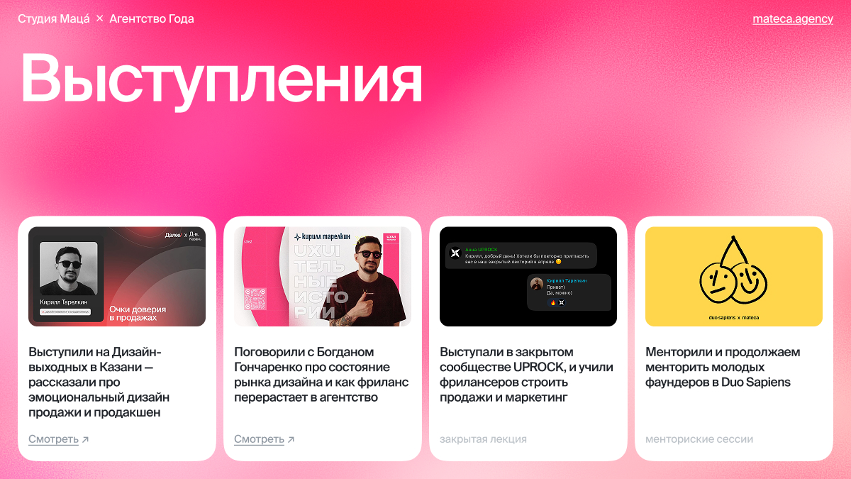 - Выступили на разных мероприятиях для дизайнеров, поделились опытом в продуктовом продакшене. Если говорить про меня, то в 2025 выступил от Мацы́ на Дизайн-выходных в Казани, рассказал про эмоциональный дизайн и продажи; поделился опытом в закрытом сообществе UPROCK и ещё много где. Ниже прикладываю ссылки на выступления.