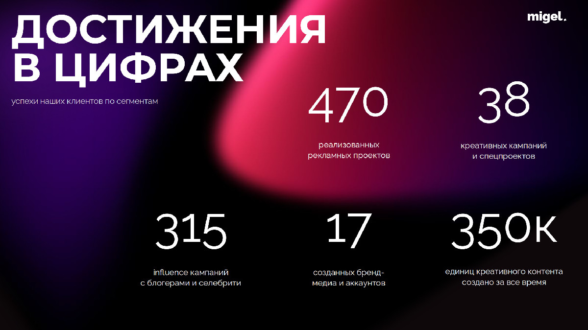 MIGEL — это экосистема, объединяющая экспертизу в контенте, influence marketing, UGC, SMM, креативе, рекламном продвижении, стратегии и аналитике. Мы не просто создаём рекламные кампании — мы выстраиваем комплексные коммуникации, которые масштабируются и дают измеримый результат.
