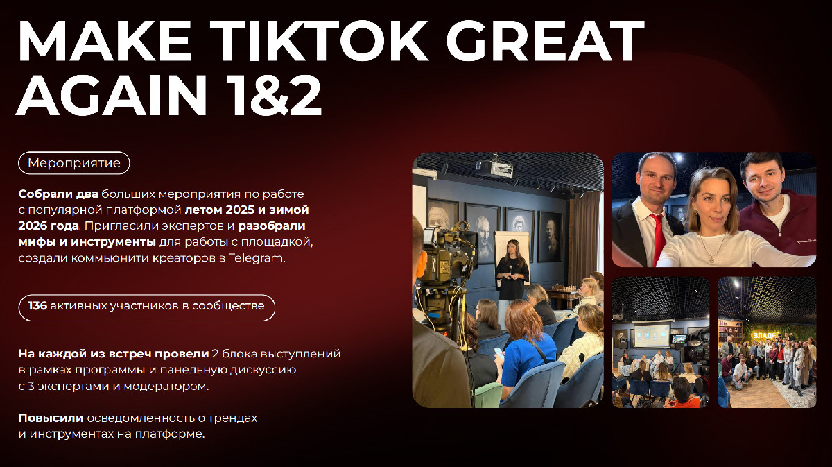 - Провели серию мероприятий MAKE TIKTOK GREAT AGAIN, посвящённых работе с платформой, инструментам и трендам, сформировав активное комьюнити креаторов (130+ участников);