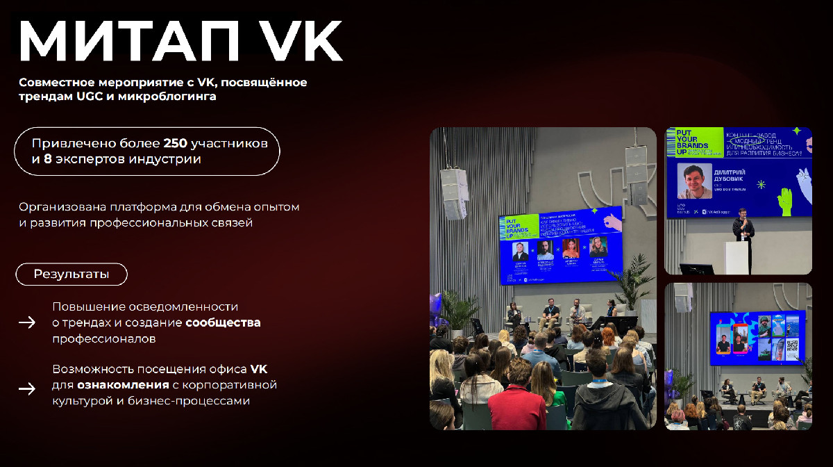 - Совместно с партнёрами реализовали митап с VK, посвящённый трендам UGC и микроблогинга, собрав более 250 участников и 8 экспертов индустрии;
