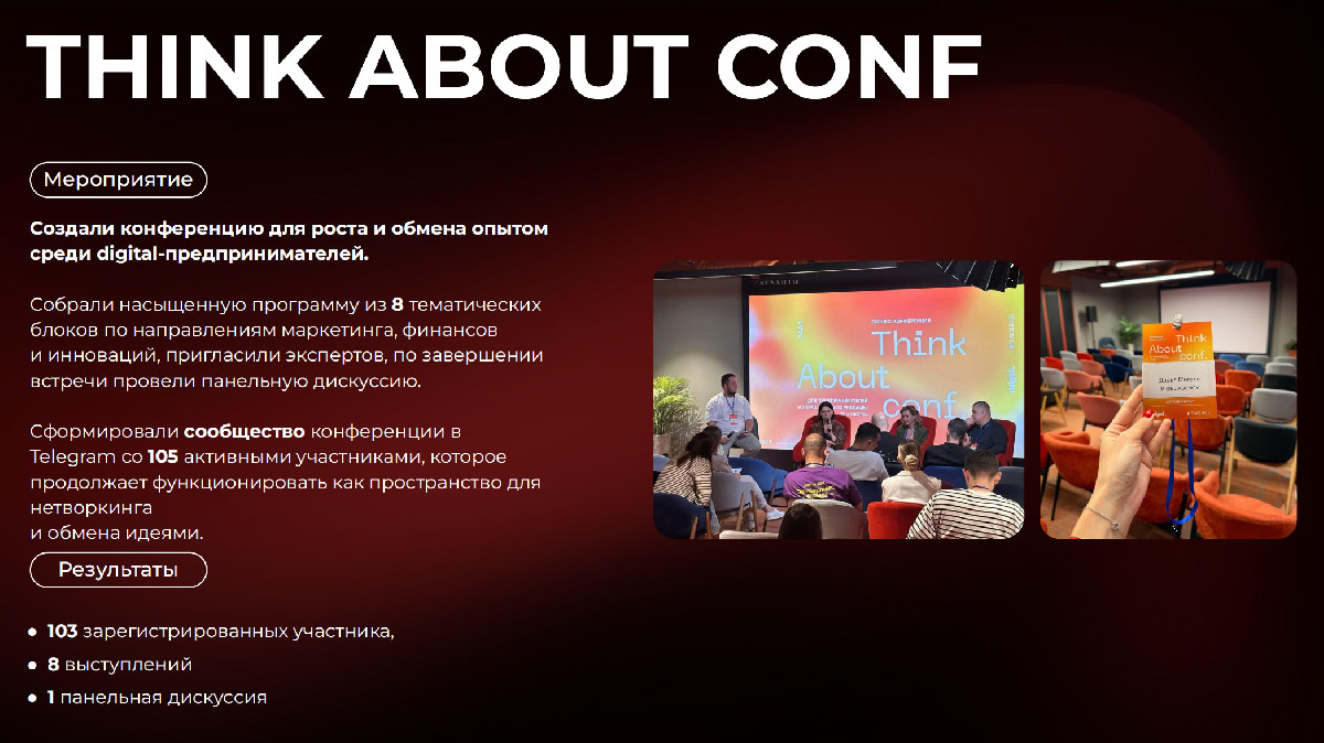 - Организовали масштабные мероприятия и конференции для профессионального сообщества, включая THINK ABOUT CONF — конференцию для digital-предпринимателей с более чем 100 участниками, 8 выступлениями и панельной дискуссией с экспертами индустрии;
