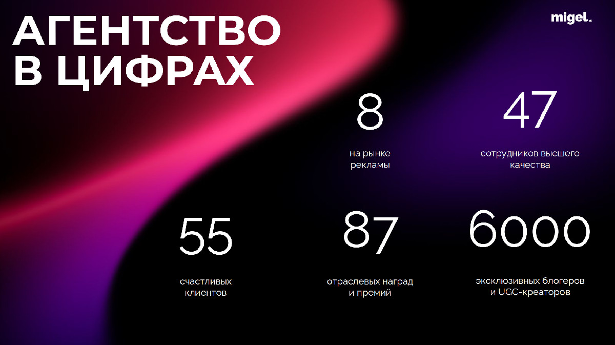 MIGEL AGENCY — независимое коммуникационное агентство с 360° маркетинговой экспертизой в digital. Уже более 8 лет мы помогаем брендам выстраивать эффективную коммуникацию с аудиторией, создавая креативные стратегии, масштабные рекламные кампании и контент, который действительно работает.