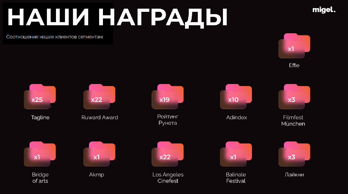 - Получили отраслевые награды и премий, усилив позиции агентства в индустрии и подтвердив высокий уровень креативной и маркетинговой экспертизы.