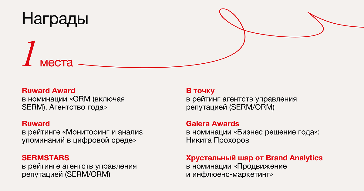 — 1 места в отраслевых рейтингах агентств управления репутацией, включая независимый рейтинг SERMSTARS и рейтинг агентств ORM/SERM «В точку».