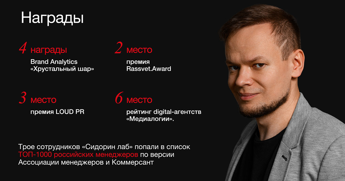 В 2025 году под руководством Никиты Прохорова компания «Сидорин лаб» укрепила свое лидерство в отрасли ORM и SERM. Компания получила 25 отраслевых премий и среди них: