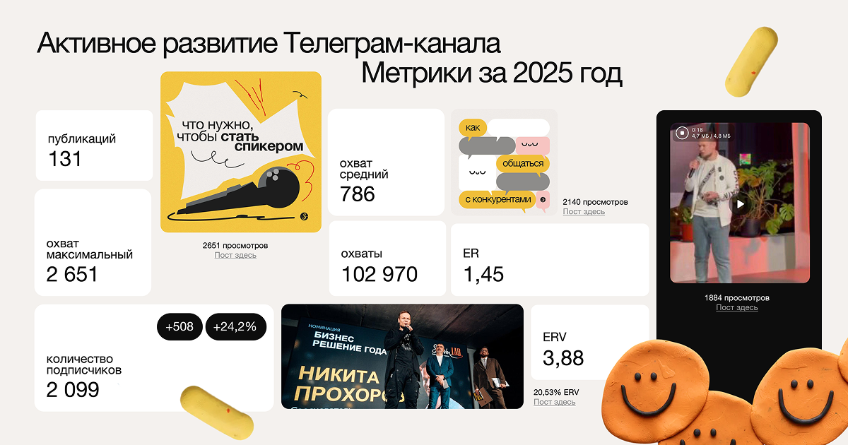 В 2025 году на канале вышло 131 публикация, а совокупный охват составил 102 970 просмотров, что на 63% больше, чем годом ранее. Количество подписчиков выросло до 2099 (+24,2%), а показатель вовлеченности ERV увеличился с 1,72 до 3,88.