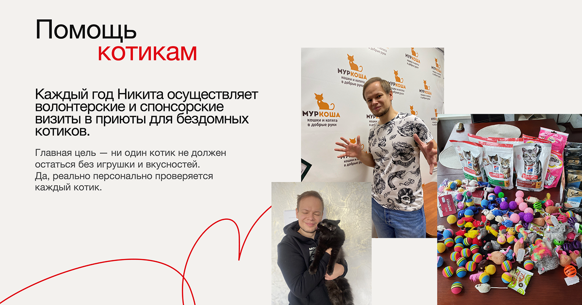А в свободное от работы время Никита занимается волонтерством и спонсирует приюты для бездомных котиков. А как известно, котики правят интернетом =)