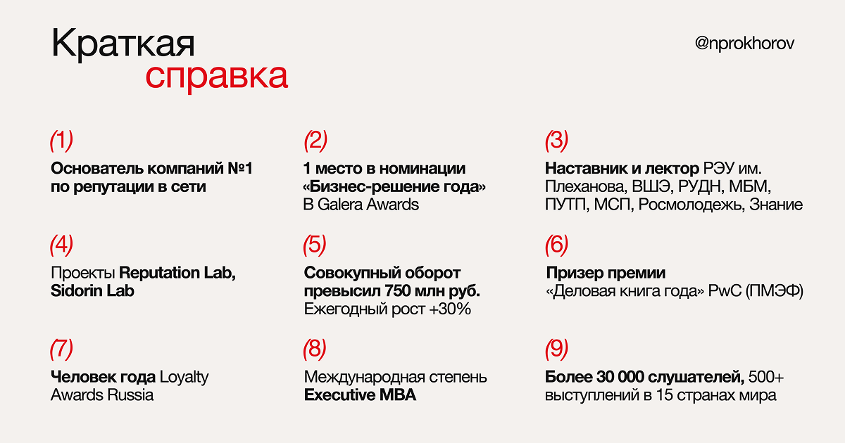 1. Более 10 лет с самого старта развивает компанию «Сидорин лаб» — крупнейшую российскую компанию в области управления репутацией.