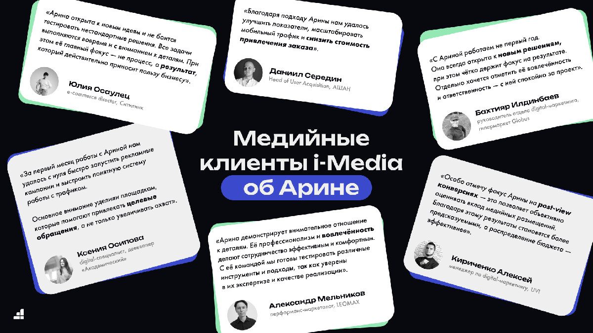 Пройти путь от ассистента аккаунт-менеджера до руководителя ключевого отдела i-Media всего за 4 года — это кейс, который вдохновляет всё агентство. Арина доказала, что в современном digital не нужно «высиживать» грейды десятилетиями. Достаточно брать на себя ответственность там, где другие пасуют, и подкреплять амбиции измеримым результатом.