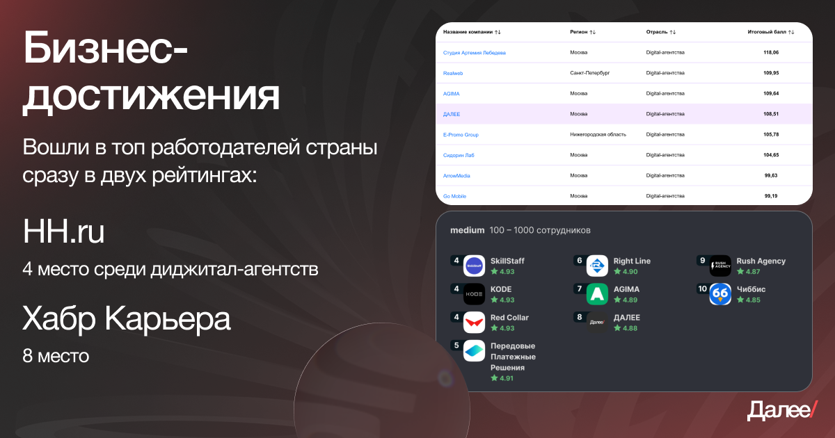 Уже несколько лет крупнейшие порталы для рекрутинга hh.ru и Хабр Карьера включают Далее в списки лучших работодателей. В 2025 году мы заняли четвертую строчку в рейтинге hh.ru и восьмую на Хабр Карьере, а еще вошли в топ 50 среди всех российских компаний. Мы обогнали крупнейших российских конкурентов по условиям труда, HR-процессам и популярности среди соискателей.