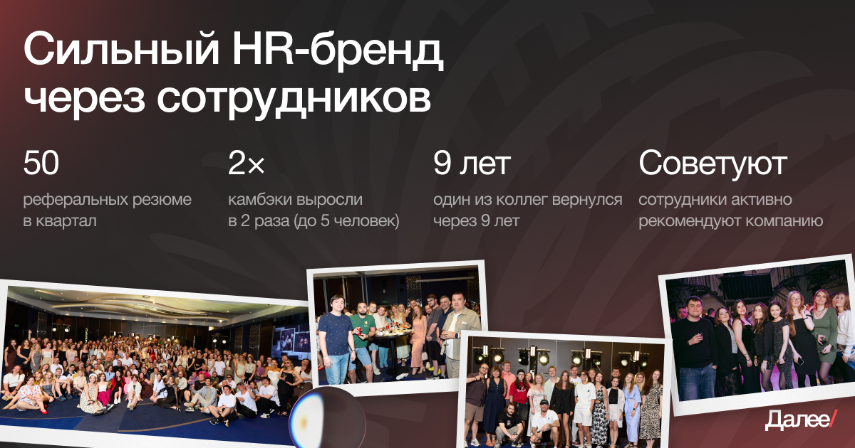 Рынок это видит: мы в топе рейтингов работодателей, каждый второй сотрудник — амбассадор, бывшие коллеги возвращаются спустя 9 лет, а реферальная программа приносит десятки резюме ежеквартально. Для нас HR — стратегический актив, чтобы создать компанию с неповторимой атмосферой.
