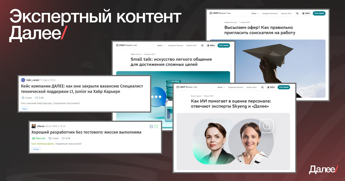 Сотрудники HR-департамента Далее — приглашенные спикеры подкастов для HR в диджитале. Мы делимся с рынком экспертизой в построении кадровых процессов, особенностях найма сотрудников разных поколений, а также создании комфортной рабочей атмосферы.
