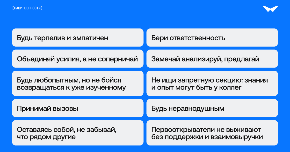В основе нашего HR-бренда — культура открытости, экспериментов и развития. Мы строим среду, где лучшие специалисты чувствуют себя частью чего-то большего: создают проекты для флагманов федерального уровня и для стартапов, завоевывающих рынок, осваивают новые технологии и воплощают идеи, которые получают глобальное признание.