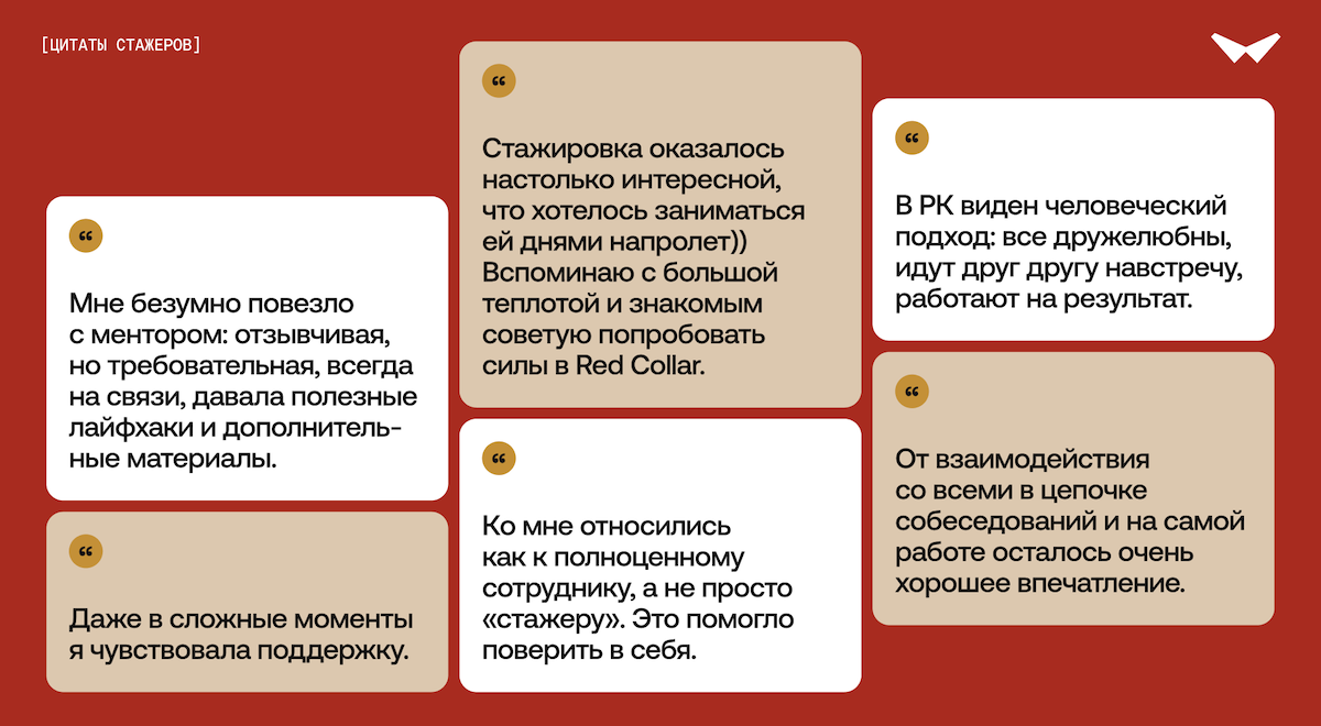Зачастую на наши стажировки очередь как в лучший бар: 181 дизайнер на одно место, а в чатах подписчики регулярно спрашивают «а когда следующий набор?». Мы растим людей, даём им свободу быть собой и делать классные вещи, и именно поэтому из Red Collar не просто не хочется уходить — сюда хочется вернуться.