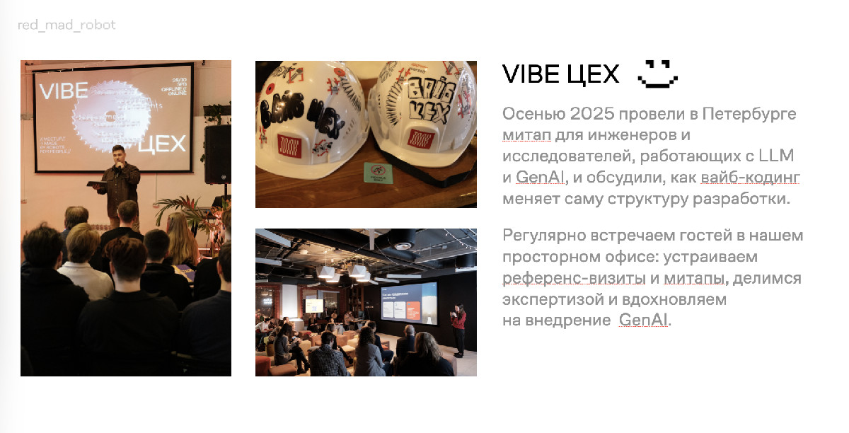 Собственные митапы: провели в Петербурге «Вайб ЦЕХ» для инженеров, которые работают с LLM и GenAI. А также в офисе, в Робохранилище, провели более 6 митапов для ЦА разработчиков.