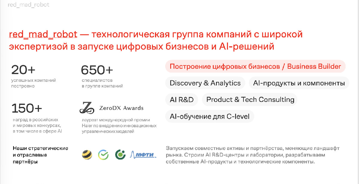 red_mad_robot — технологическая группа компаний с широкой экспертизой в запуске цифровых бизнесов и AI-решений