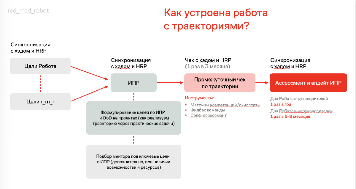 - Траектории развития. Индивидуальные планы развития (ИПР) и матрицы компетенций помогают совместить цели робота и компании. Ассессмент проводим раз в 6–9 месяцев.
