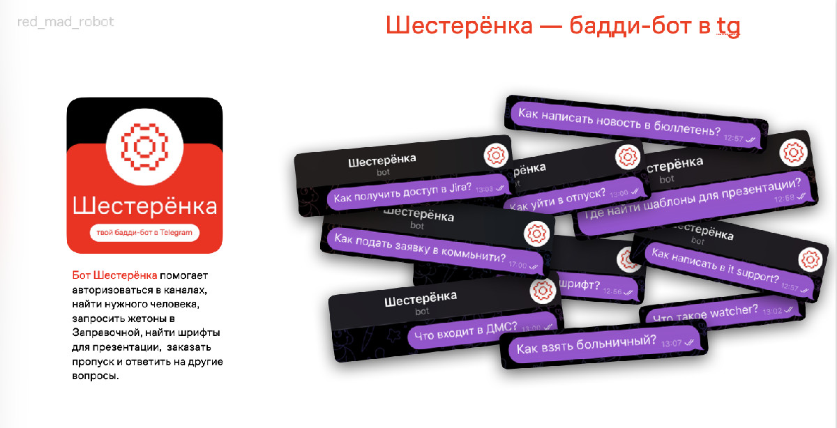 - Бот «Шестерёнка». Помогает в Telegram найти коллег, заказать пропуск или запросить внутреннюю валюту — жетоны.