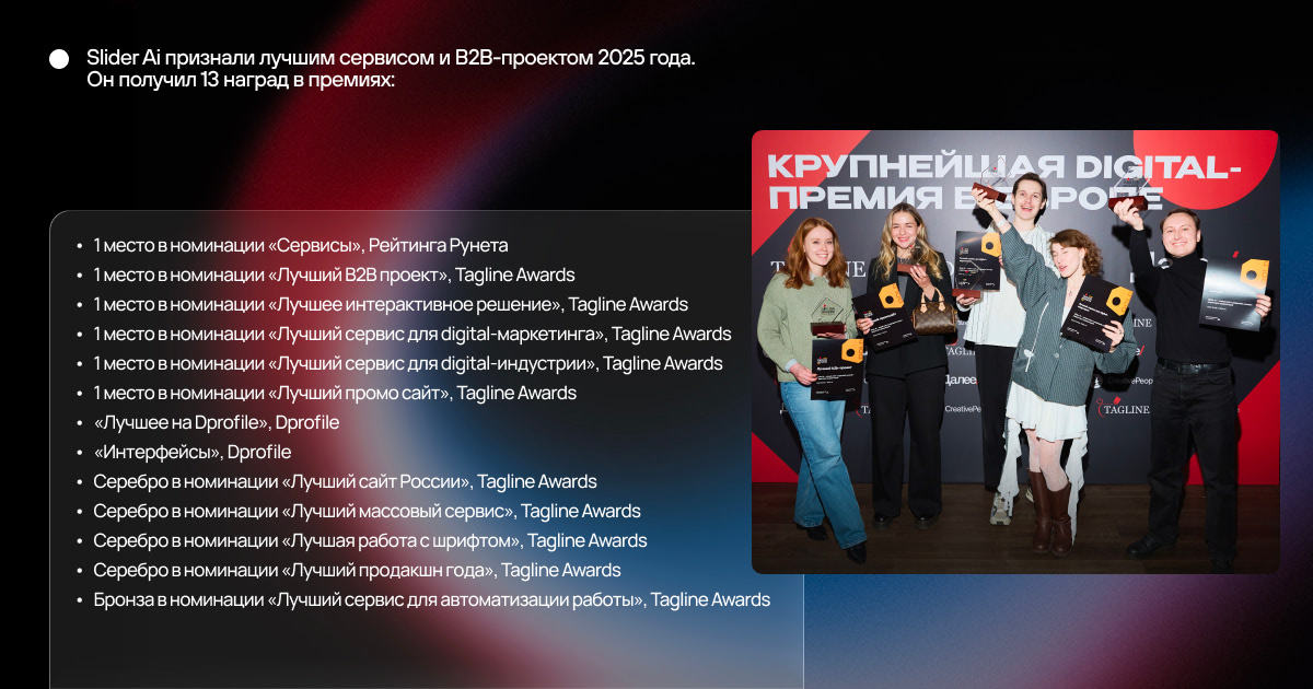 Также Slider Ai уже получили звание лучшего сервиса 2025 года по версии премии Рейтинг Рунета, 10 наград Tagline Awards 2025 (среди которых «Лучший B2B проект» и «Лучший сервис для digital-индустрии») и награды «Лучшее на Dprofile» и «Интерфейсы» по версии площадки Dprofile в 2026 году:
