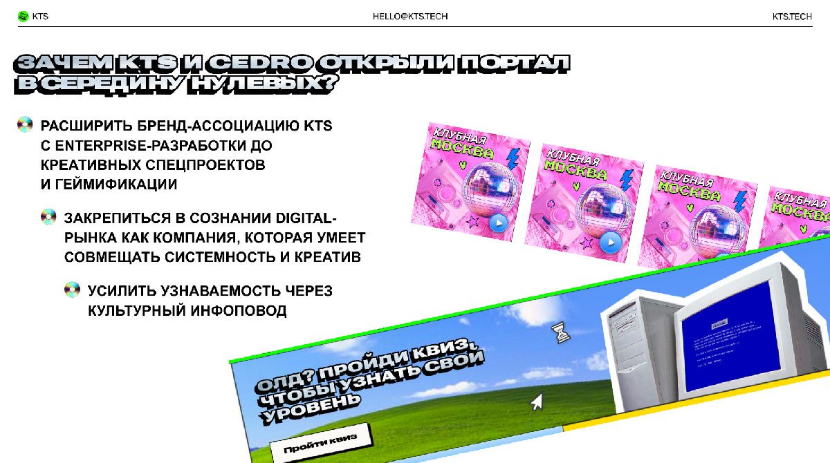 - расширить бренд-ассоциацию KTS с enterprise-разработки до креативных спецпроектов и геймификации