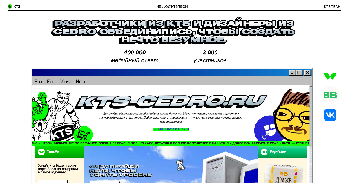 Разработчики из KTS и дизайнеры из Cedro объединились, чтобы создать нечто безумное. Мы открыли портал в середину нулевых и запустили кроссбрендовый спецпроект в эстетике интернета 2000-х с интеграцией реальных продуктов VK Музыки, Twinby и ВкусВилл.