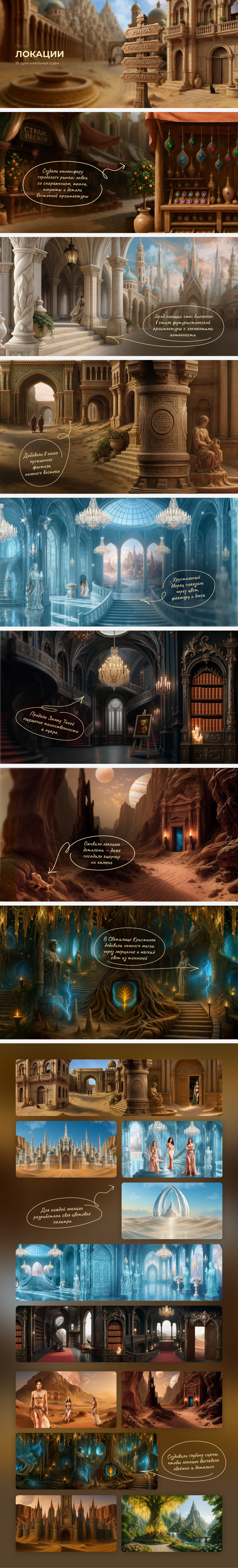 - Контролировали детализацию архитектуры и повторяемость визуального языка между сценами.