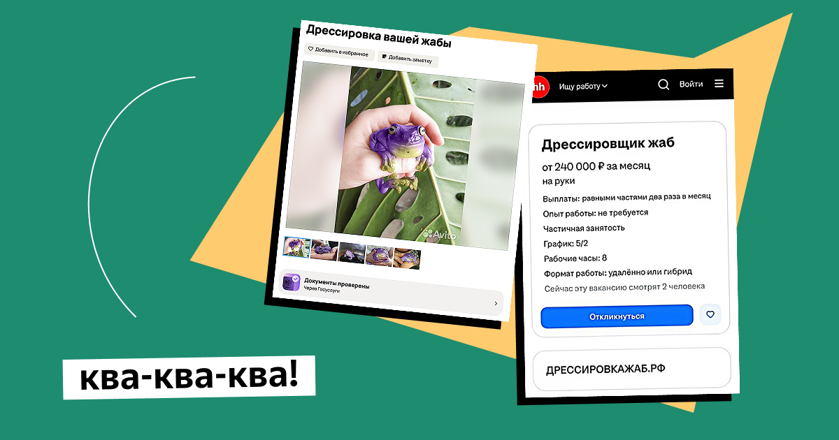 Кроме сайта, мы создали фейковую вакансию в «компании по дрессировке жаб» и объявление на «Авито» с такой же услугой. А еще, говорят, на улицах видели таинственного человека в спецодежде «дрессировкажаб.рф».