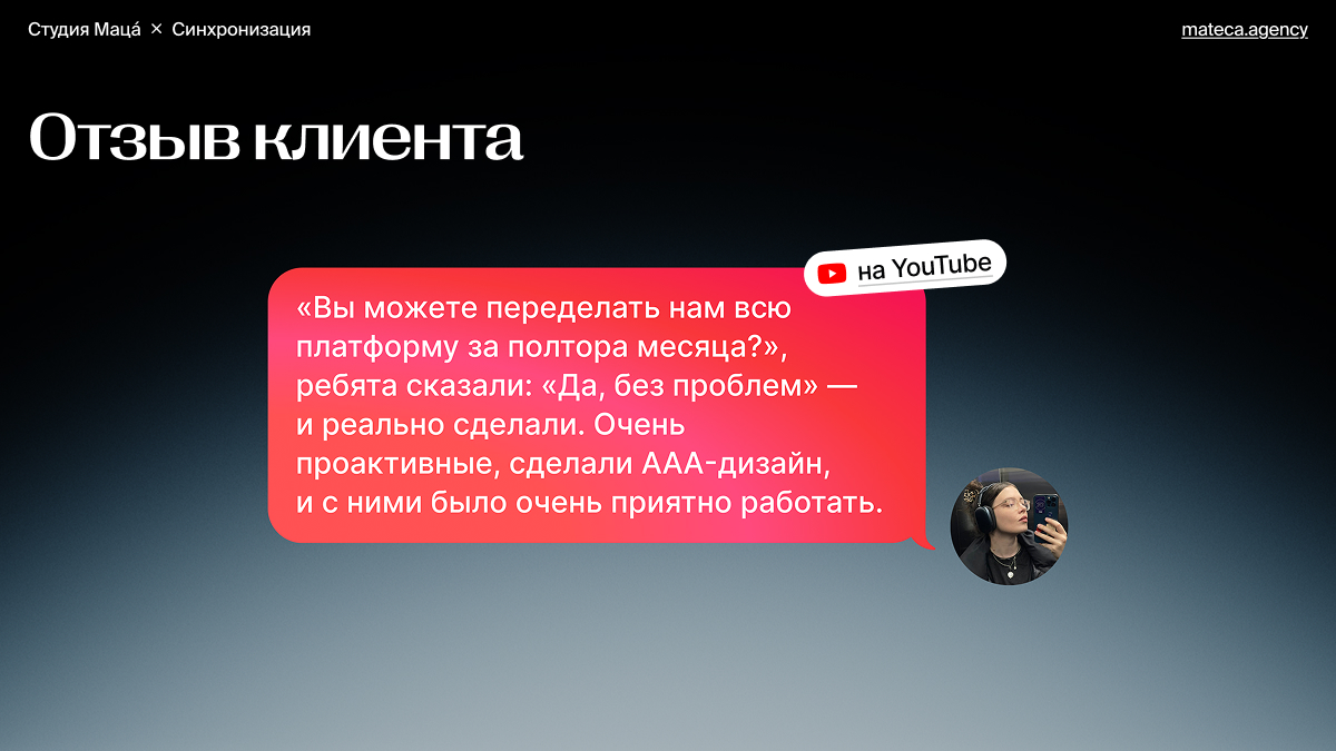 Мы попросили продакта — Таню, записать небольшой видеоролик с отзывом о нашей работе и поделиться впечатлениями о готовом продукте. В итоге получилось несколько минут искренних слов благодарности, что, конечно, очень приятно!